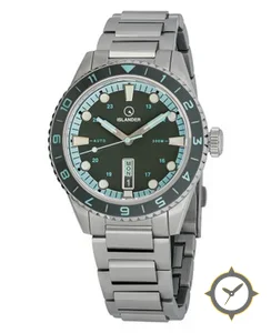 Eine Taucheruhr-Uhr mit einem 33.5mm Gehäuse im Vintage-Stil gefertigt aus Edelstahl mit einem Zifferblatt in grün und einer besonderen "sunburst gradient"-Oberfläche.