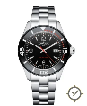 Eine Taucheruhr-Uhr mit einem markanten 50.5mm Auftritt am Handgelenk, gefertigt aus Edelstahl mit einem Zifferblatt in schwarz und einer besonderen "glossy"-Oberfläche.