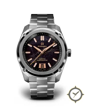 Eine Luxus-Uhr mit einem vielseitigen 38.5mm Gehäuse, das an fast jedes Handgelenk passt, gefertigt aus Edelstahl mit einem Zifferblatt in schwarz und einer besonderen "marbled"-Oberfläche.