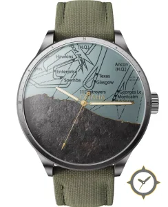 Eine Militär-Uhr mit einem 37.5mm Gehäuse im Vintage-Stil gefertigt aus Edelstahl mit einem Zifferblatt in türkis und einer besonderen "upper map print with lower textured rock inlay"-Oberfläche.