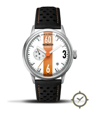 Eine Racing-Uhr mit einem 35.5mm Gehäuse im Vintage-Stil gefertigt aus Edelstahl mit einem Zifferblatt in weiß und einer besonderen "glossy"-Oberfläche.