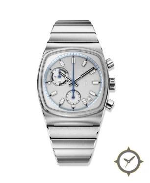 Eine Chronograph-Uhr mit einem vielseitigen 38.5mm Gehäuse, das an fast jedes Handgelenk passt, gefertigt aus Edelstahl mit einem Zifferblatt in silber und einer besonderen "brushed"-Oberfläche.