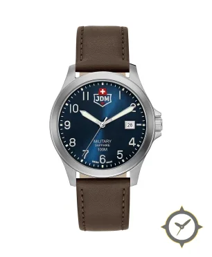 Eine Militär-Uhr mit einem 32mm Gehäuse im Vintage-Stil gefertigt aus Edelstahl mit einem Zifferblatt in blau und einer besonderen "sunburst"-Oberfläche.