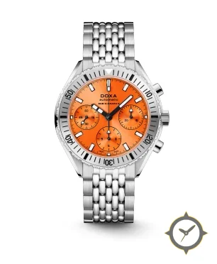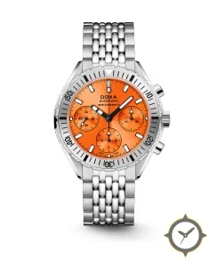Eine Taucheruhr-Uhr mit einem markanten 49mm Auftritt am Handgelenk, gefertigt aus Edelstahl mit einem Zifferblatt in orange und einer besonderen "sunburst"-Oberfläche.