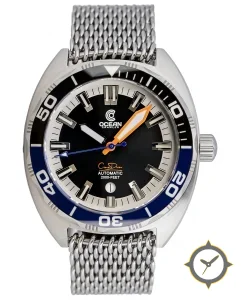 Eine Taucheruhr-Uhr mit einem markanten 50mm Auftritt am Handgelenk, gefertigt aus Edelstahl mit einem Zifferblatt in schwarz und einer besonderen "matte"-Oberfläche.