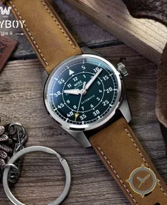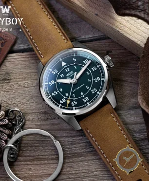 Eine Pilot-Uhr mit einem 36mm Gehäuse im Vintage-Stil gefertigt aus Edelstahl mit einem Zifferblatt in grün und einer besonderen "textured (grainy/sunburst appearance)"-Oberfläche.