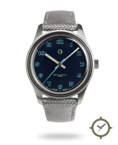 Eine Field-Uhr mit einem markanten 42mm Auftritt am Handgelenk, gefertigt aus Edelstahl mit einem Zifferblatt in blau und einer besonderen "matte"-Oberfläche.