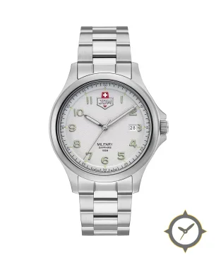 Eine Militär-Uhr mit einem markanten 50mm Auftritt am Handgelenk, gefertigt aus Edelstahl mit einem Zifferblatt in weiß und einer besonderen "grained/textured"-Oberfläche.