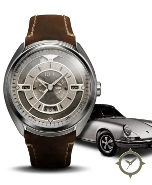 Eine Vintage-Uhr mit einem markanten 50mm Auftritt am Handgelenk, gefertigt aus Edelstahl mit einem Zifferblatt in grau und einer besonderen "brushed center with a textured/grained outer ring"-Oberfläche.