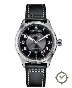 Eine Pilot-Uhr mit einem markanten 45mm Auftritt am Handgelenk, gefertigt aus Edelstahl mit einem Zifferblatt in schwarz und einer besonderen "guilloché/engine-turned center with matte outer chapter ring"-Oberfläche.