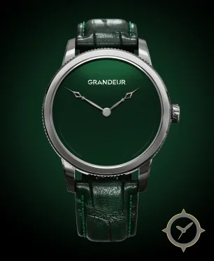Eine Minimalistisch-Uhr gefertigt aus Edelstahl mit einem Zifferblatt in grün und einer besonderen "glossy lacquer"-Oberfläche.