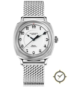 Eine Dress-Uhr mit einem markanten 44mm Auftritt am Handgelenk, gefertigt aus Edelstahl mit einem Zifferblatt in weiß und einer besonderen "enamel"-Oberfläche.