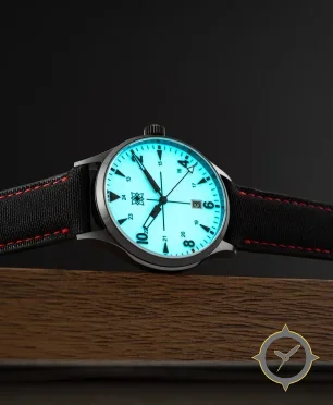 Eine Pilot-Uhr mit einem 36mm Gehäuse im Vintage-Stil gefertigt aus Edelstahl mit einem Zifferblatt in türkis und einer besonderen "luminous/glowing"-Oberfläche.