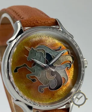 Eine Dress-Uhr mit einem vielseitigen 40.5mm Gehäuse, das an fast jedes Handgelenk passt, gefertigt aus Edelstahl mit einem Zifferblatt in gold und einer besonderen "iridescent/mother-of-pearl-like finish"-Oberfläche.