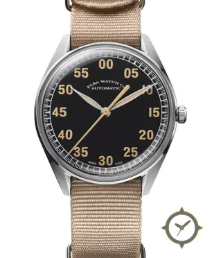 Eine Pilot-Uhr mit einem 34.5mm Gehäuse im Vintage-Stil gefertigt aus Edelstahl mit einem Zifferblatt in schwarz und einer besonderen "matte"-Oberfläche.