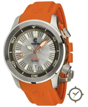 Eine Taucheruhr-Uhr mit einem markanten 49.5mm Auftritt am Handgelenk, gefertigt aus Edelstahl mit einem Zifferblatt in silber und einer besonderen "radial sunburst / brushed"-Oberfläche.