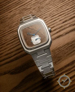 Eine Luxus-Uhr mit einem 32mm Gehäuse im Vintage-Stil gefertigt aus Edelstahl mit einem Zifferblatt in braun und einer besonderen "aged, cracked organic texture (wood or leather-like) with visible grain/veins"-Oberfläche.