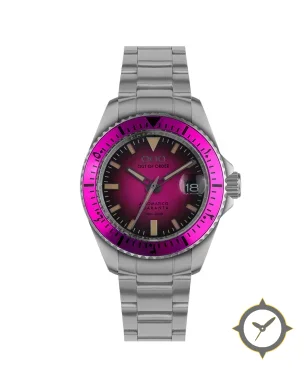 Eine Taucheruhr-Uhr mit einem markanten 43.5mm Auftritt am Handgelenk, gefertigt aus Edelstahl mit einem Zifferblatt in lila und einer besonderen "sunburst gradient"-Oberfläche.