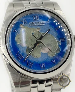 Eine Dress-Uhr mit einem vielseitigen 38mm Gehäuse, das an fast jedes Handgelenk passt, gefertigt aus Edelstahl mit einem Zifferblatt in blau und einer besonderen "enamel / hand-painted finish"-Oberfläche.