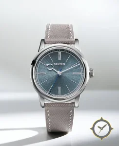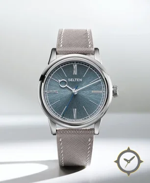 Eine Dress-Uhr mit einem 33.5mm Gehäuse im Vintage-Stil gefertigt aus Edelstahl mit einem Zifferblatt in blau und einer besonderen "sunburst / radial brushing"-Oberfläche.