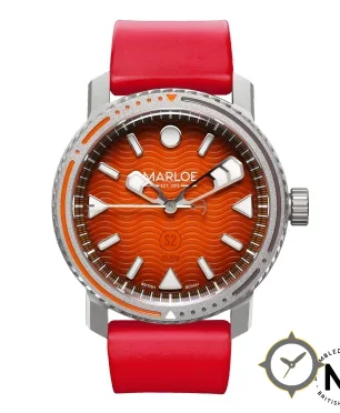 Eine Taucheruhr-Uhr mit einem markanten 44.5mm Auftritt am Handgelenk, gefertigt aus Edelstahl mit einem Zifferblatt in orange und einer besonderen "wavy (wave guilloché)"-Oberfläche.