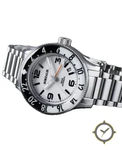 Eine GMT-Uhr mit einem 37mm Gehäuse im Vintage-Stil gefertigt aus Edelstahl mit einem Zifferblatt in weiß und einer besonderen "lacquer"-Oberfläche und einer echten GMT-Funktion, mit der du eine zweite Zeitzone verfolgen kannst.
