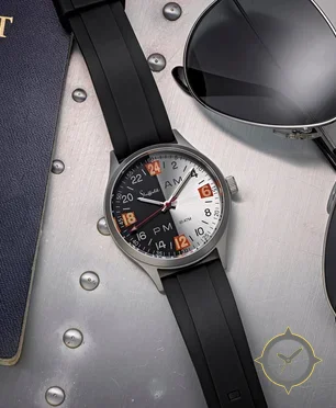 Eine GMT-Uhr mit einem 34mm Gehäuse im Vintage-Stil gefertigt aus Edelstahl mit einem Zifferblatt in silber und einer besonderen "two-tone: sunburst silver right half, matte black left half"-Oberfläche und einer echten GMT-Funktion, mit der du eine zweite Zeitzone verfolgen kannst.
