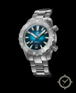 Eine Taucheruhr-Uhr mit einem 35mm Gehäuse im Vintage-Stil gefertigt aus Edelstahl mit einem Zifferblatt in blau und einer besonderen "sunburst gradient (fumé)"-Oberfläche.