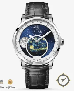 Eine Dress-Uhr mit einem markanten 43.5mm Auftritt am Handgelenk, gefertigt aus Edelstahl mit einem Zifferblatt in blau und einer besonderen "radial sunburst with printed artwork"-Oberfläche und einer wunderschönen Mondphasenanzeige.