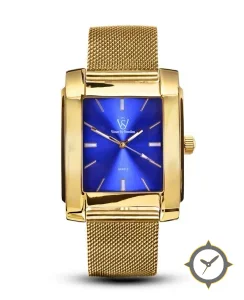 Eine Dress-Uhr mit einem 32.5mm Gehäuse im Vintage-Stil gefertigt aus Gold mit einem Zifferblatt in blau und einer besonderen "sunburst"-Oberfläche.