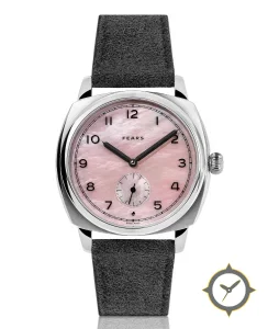 Eine Dress-Uhr mit einem 32.5mm Gehäuse im Vintage-Stil gefertigt aus Edelstahl mit einem Zifferblatt in weiß und einer besonderen "mother-of-pearl"-Oberfläche.