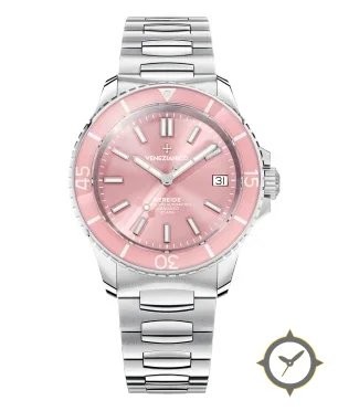 Eine Taucheruhr-Uhr mit einem markanten 46mm Auftritt am Handgelenk, gefertigt aus Edelstahl mit einem Zifferblatt in karmesinrot und einer besonderen "sunburst"-Oberfläche.