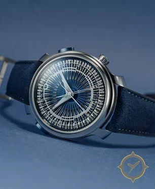 Eine Skelett-Uhr mit einem vielseitigen 40.5mm Gehäuse, das an fast jedes Handgelenk passt, gefertigt aus Edelstahl mit einem Zifferblatt in blau und einer besonderen "sunburst"-Oberfläche.