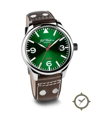 Eine Pilot-Uhr mit einem 35mm Gehäuse im Vintage-Stil gefertigt aus Edelstahl mit einem Zifferblatt in grün und einer besonderen "sunburst"-Oberfläche.