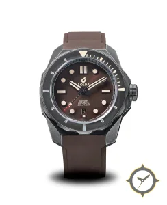 Eine Taucheruhr-Uhr mit einem markanten 46.5mm Auftritt am Handgelenk, gefertigt aus Edelstahl mit einem Zifferblatt in braun und einer besonderen "sunburst/ombré gradient"-Oberfläche.