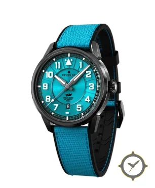 Eine Pilot-Uhr mit einem 37.5mm Gehäuse im Vintage-Stil gefertigt aus Edelstahl mit einem Zifferblatt in türkis und einer besonderen "sunburst"-Oberfläche.