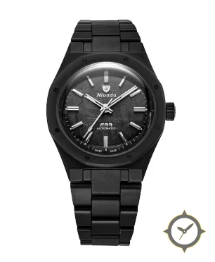Eine Sport-Uhr mit einem 36mm Gehäuse im Vintage-Stil gefertigt aus Edelstahl mit einem Zifferblatt in schwarz und einer besonderen "meteorite / Widmanstätten-style textured finish"-Oberfläche.