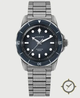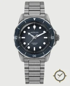 Eine Taucheruhr-Uhr mit einem 36.5mm Gehäuse im Vintage-Stil gefertigt aus Edelstahl mit einem Zifferblatt in marineblau und einer besonderen "sunburst"-Oberfläche.