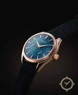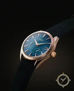 Eine Dress-Uhr mit einem markanten 42mm Auftritt am Handgelenk, gefertigt aus Gold mit einem Zifferblatt in blau und einer besonderen "guilloché (waffle) textured surface"-Oberfläche und einer praktischen Gangreserveanzeige.