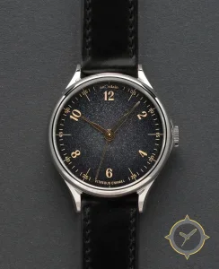 Eine Dress-Uhr mit einem 32mm Gehäuse im Vintage-Stil gefertigt aus Edelstahl mit einem Zifferblatt in grün und einer besonderen "vitreous enamel, textured/granular"-Oberfläche.