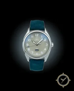 Eine GMT-Uhr mit einem 33.5mm Gehäuse im Vintage-Stil gefertigt aus Edelstahl mit einem Zifferblatt in grau und einer besonderen "matte"-Oberfläche und einer echten GMT-Funktion, mit der du eine zweite Zeitzone verfolgen kannst.