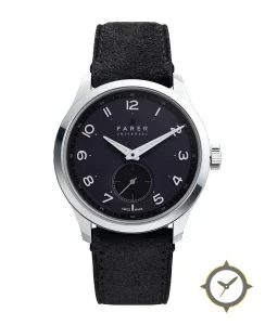 Eine Dress-Uhr mit einem 32.5mm Gehäuse im Vintage-Stil gefertigt aus Edelstahl mit einem Zifferblatt in schwarz und einer besonderen "matte, slightly grained finish"-Oberfläche.