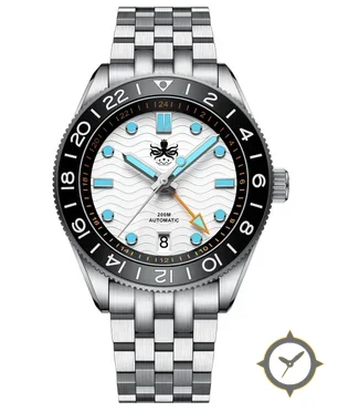 Eine GMT-Uhr mit einem markanten 41.5mm Auftritt am Handgelenk, gefertigt aus Edelstahl mit einem Zifferblatt in weiß und einer besonderen "wavy/engraved wave pattern"-Oberfläche und einer echten GMT-Funktion, mit der du eine zweite Zeitzone verfolgen kannst.