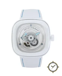 Eine Skelett-Uhr mit einem markanten 48.5mm Auftritt am Handgelenk, gefertigt aus Edelstahl mit einem Zifferblatt in weiß und einer besonderen "open-work / skeletonised with layered rings and visible movement"-Oberfläche.
