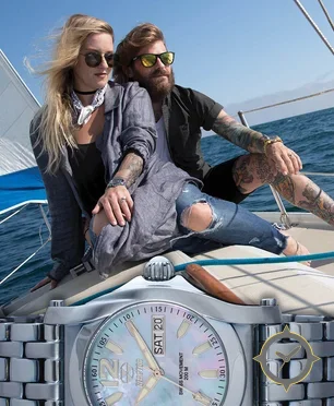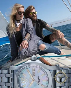 Eine Taucheruhr-Uhr mit einem 36mm Gehäuse im Vintage-Stil gefertigt aus Edelstahl mit einem Zifferblatt in weiß und einer besonderen "mother-of-pearl iridescent"-Oberfläche.