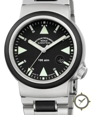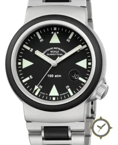Eine Taucheruhr-Uhr mit einem markanten 49.5mm Auftritt am Handgelenk, gefertigt aus Edelstahl mit einem Zifferblatt in schwarz und einer besonderen "matte"-Oberfläche.