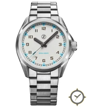 Eine Field-Uhr mit einem markanten 45.5mm Auftritt am Handgelenk, gefertigt aus Edelstahl mit einem Zifferblatt in weiß und einer besonderen "matte"-Oberfläche.