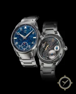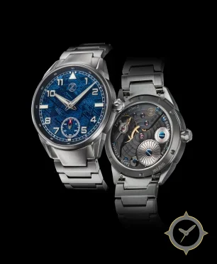 Eine Pilot-Uhr mit einem markanten 44.5mm Auftritt am Handgelenk, gefertigt aus Edelstahl mit einem Zifferblatt in blau und einer besonderen "meteorite-like textured surface with visible striations"-Oberfläche.