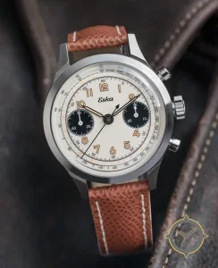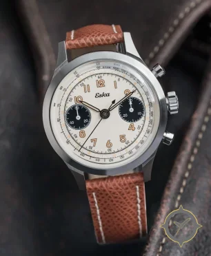 Eine Chronograph-Uhr mit einem 31.5mm Gehäuse im Vintage-Stil gefertigt aus Edelstahl mit einem Zifferblatt in weiß und einer besonderen "smooth lacquer"-Oberfläche.