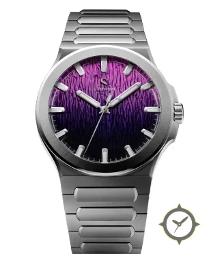 Eine Sport-Uhr mit einem 36.5mm Gehäuse im Vintage-Stil gefertigt aus Edelstahl mit einem Zifferblatt in lila und einer besonderen "textured (vertical bark/woodgrain relief)"-Oberfläche.